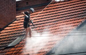 Reinigung von Dachziegel unter Druck und mit einem umweltfreundlichen Reinigungsmittel zur Bekämpfung von oberflächlichen Verschmutzungen.